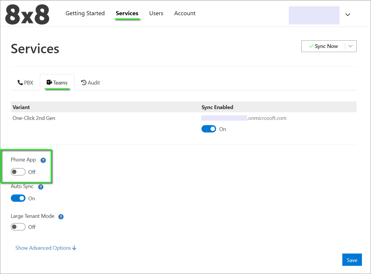 - In the Services > Teams tab of the admin portal, click the Phone App toggle switch to disable it (Off).