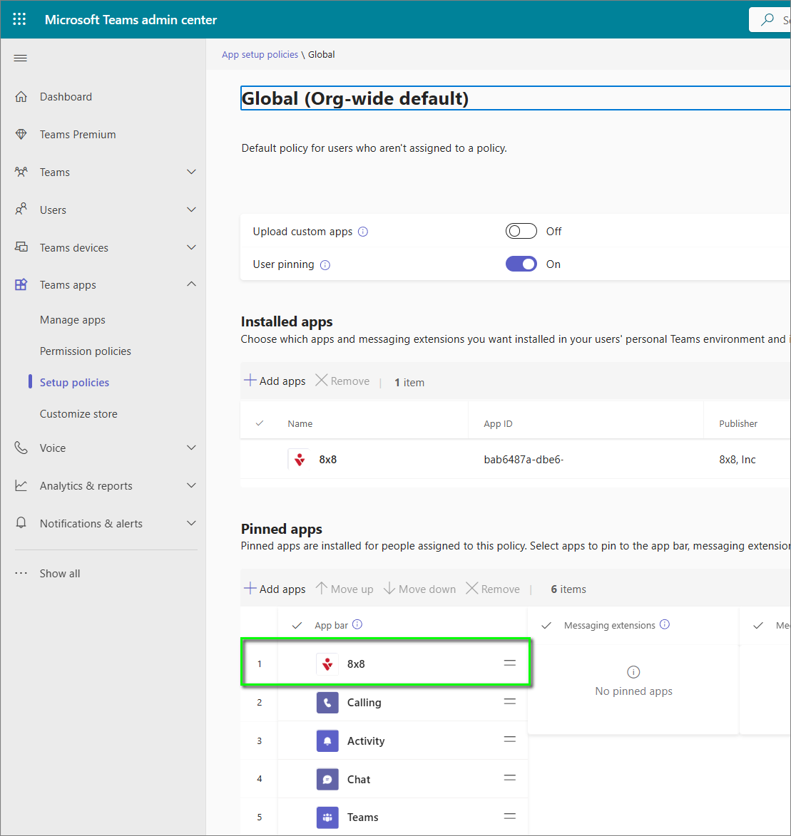 Whichever is used, the assigned policy can be edited to pin the 8x8 Teams app to appear in a specific location of Teams users’ app bar.