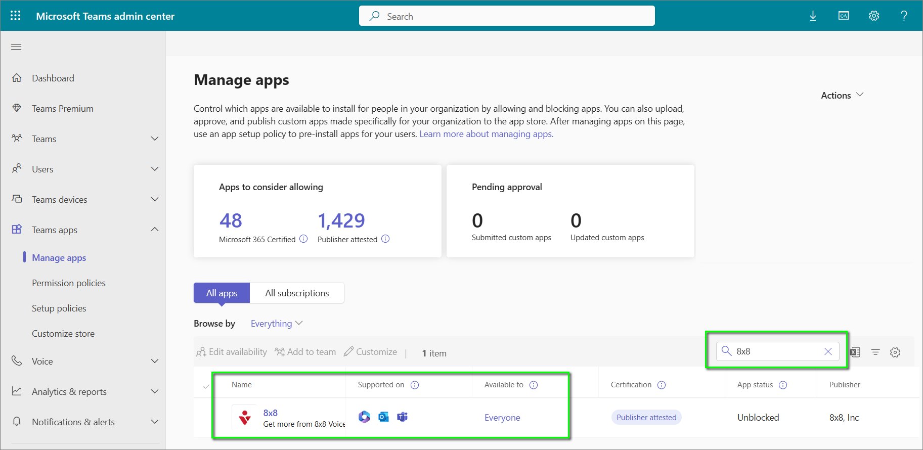 A Teams administrator should then ensure that the 8x8 Teams app is available to users.