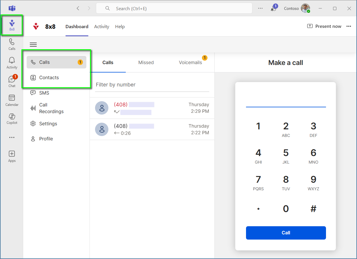 They can then access the 8x8 Teams app from their Teams app bar, and log into the app to access all of its features, including initiating outbound PSTN calls.