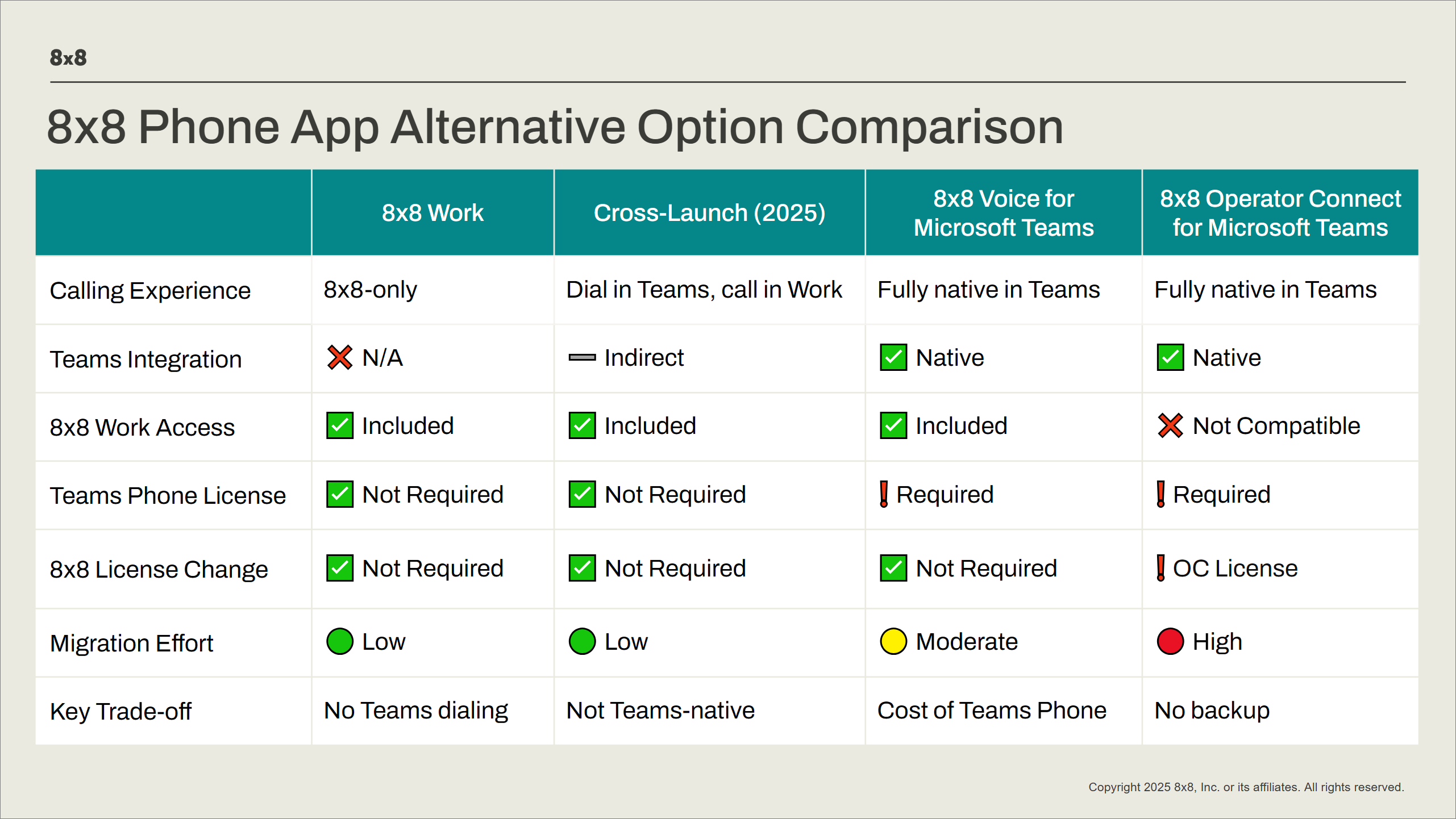 - 8x8 Work: Users can continue placing and receiving PSTN calls using the 8x8 Work app for Desktop, Mobile, or Web. This option does not require any licensing changes or Microsoft Teams integration, and is best for users who do not need to initiate calls from Teams.