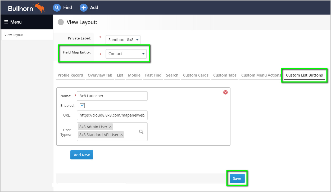 Regarding User Types:User Types is effectively a Bullhorn group permissions list. Any Bullhorn users who require access to the 8x8 integration must be members of one or more groups which the Bullhorn administrator must add to the User Types area.The 8x8 Launcher link embedded in the object action bar will not appear, otherwise.This is true for any link that the Bullhorn administrator chooses to add to the Bullhorn service using this method, regardless of whether or not the link is to the 8x8 integration.