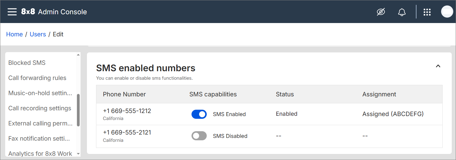 Only 8x8 Admin Console administrators may enable SMS for a specific user phone number.