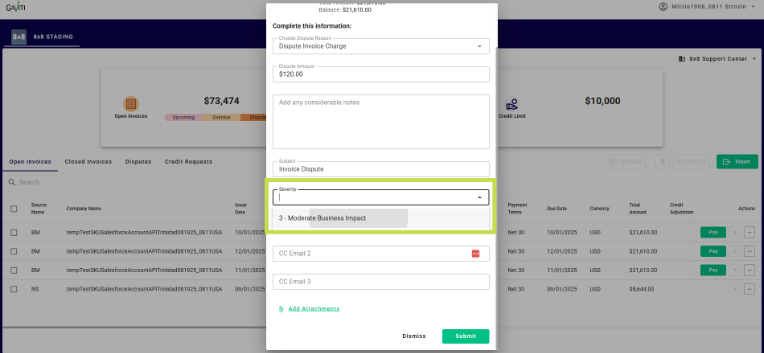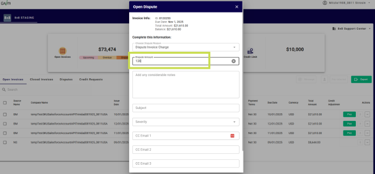 8. Enter the amount to dispute for the invoice which should be equal or less than the invoice amount.
