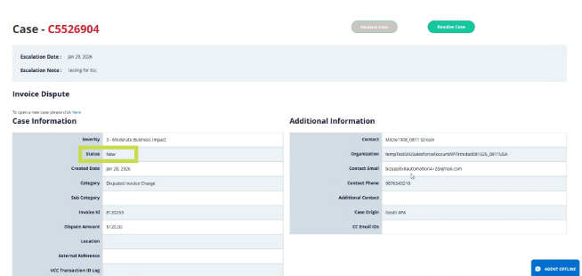 You can review the case information and status regarding the dispute. Please note, the escalate button does not appear immediately. The time frame for when the button appears is as follows: Priority 1, 1 hour elapsed; Priority 2, 4 hours elapsed; Priority 3, 24 hours elapsed.