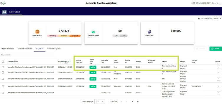 13. Once the Case is automatically created, the Dispute Case ID number will be displayed. The Disputes Tab offers a quick overview of the submission date, the current case status, the disputed invoice ID number, the disputed amount, and the Adjustment Amount, which represents the actual approved adjustment amount once the case is resolved and settled.