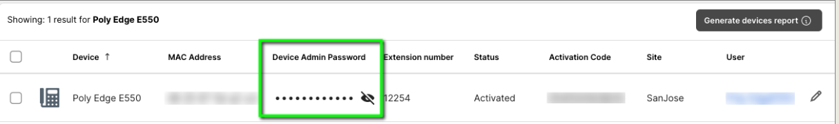 Account admins can view the device model, MAC Address, activation status, assigned user, and both Device Admin Passwords and User Web GUI Passwords.