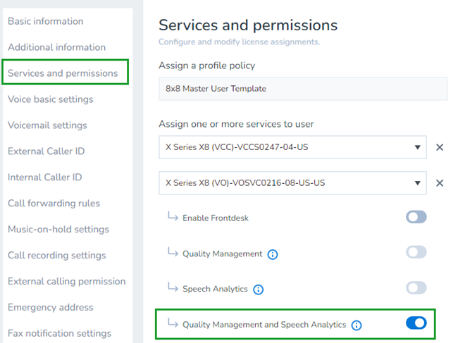 - Under Assign one or more services to user, toggle on Quality Management and Speech Analytics (blue).