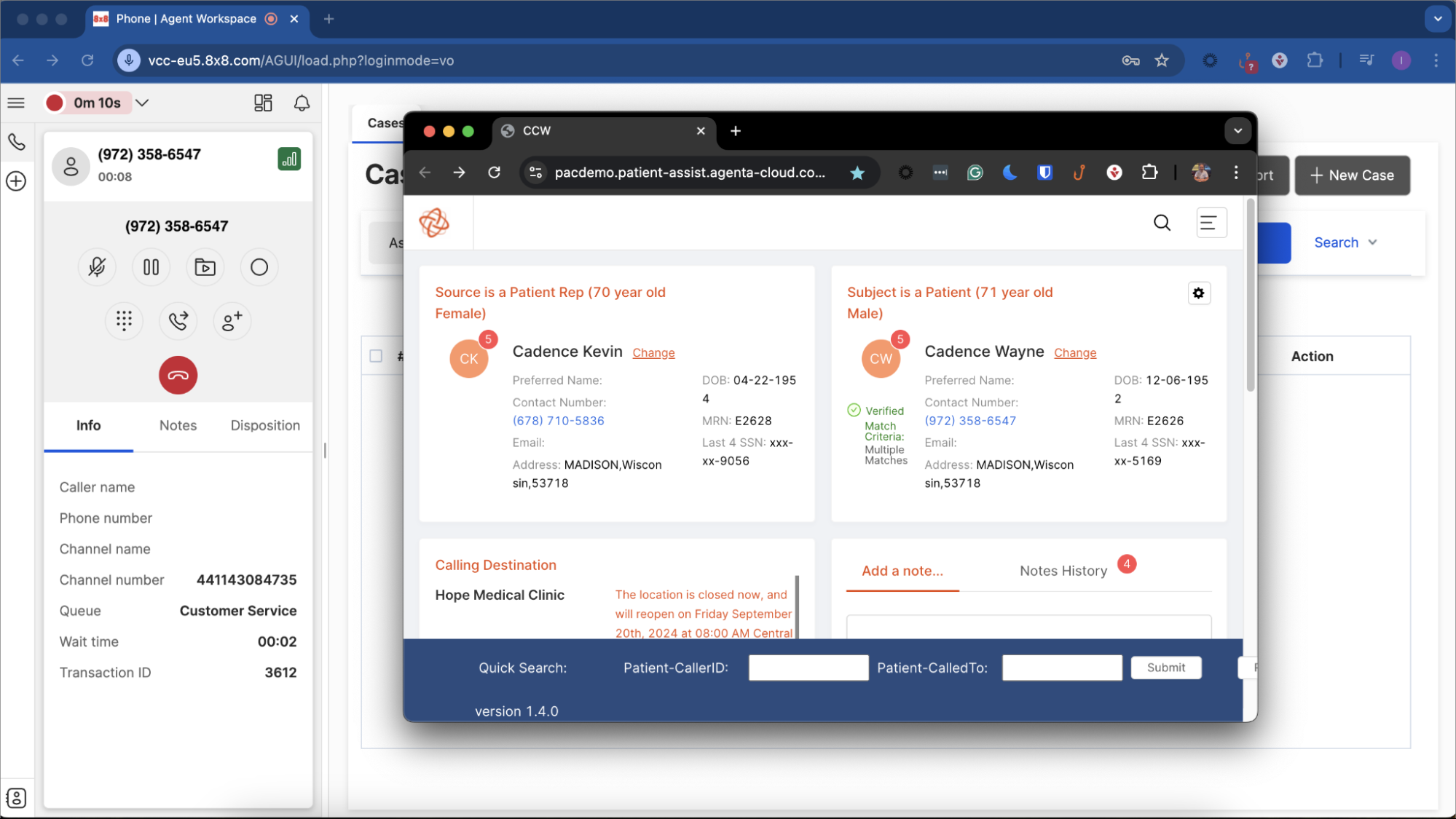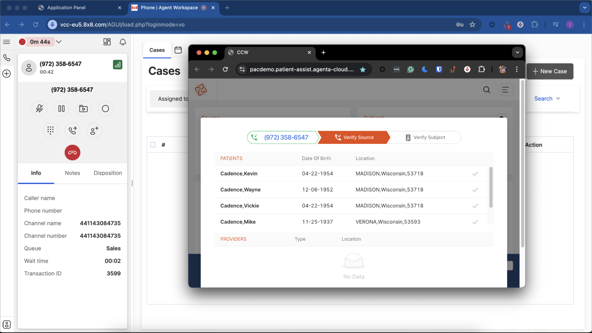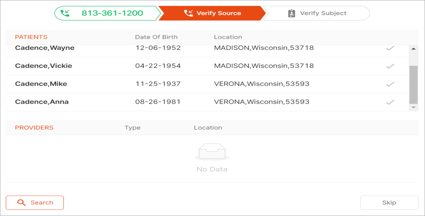 - Shows multiple matched SpinSci inbound caller Patient Assist records (family) popped for the Contact Center agent.
