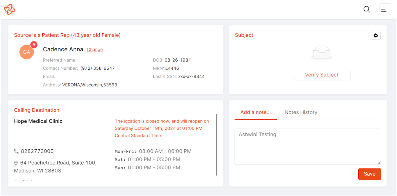 - The agent has verified the caller and can now see their patient data including appointments, billing, medical records etc.