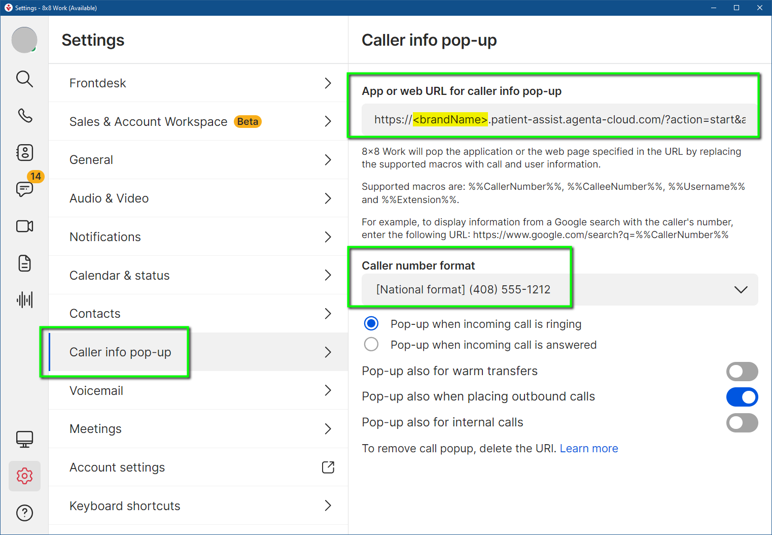 8x8 Work Caller Info-Pop Examples and Configuration