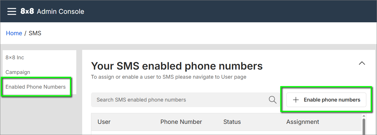 - From the left menu, select SMS enabled numbers or scroll down to that section.