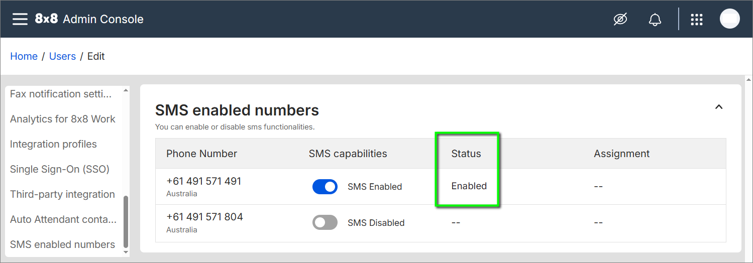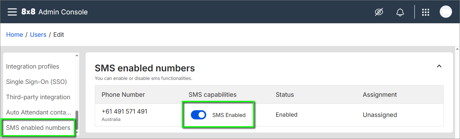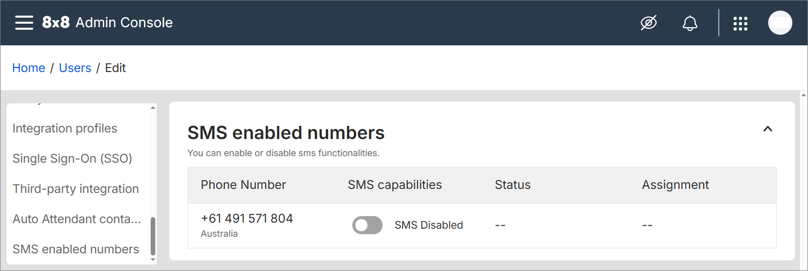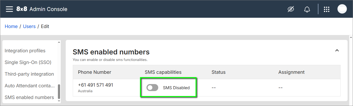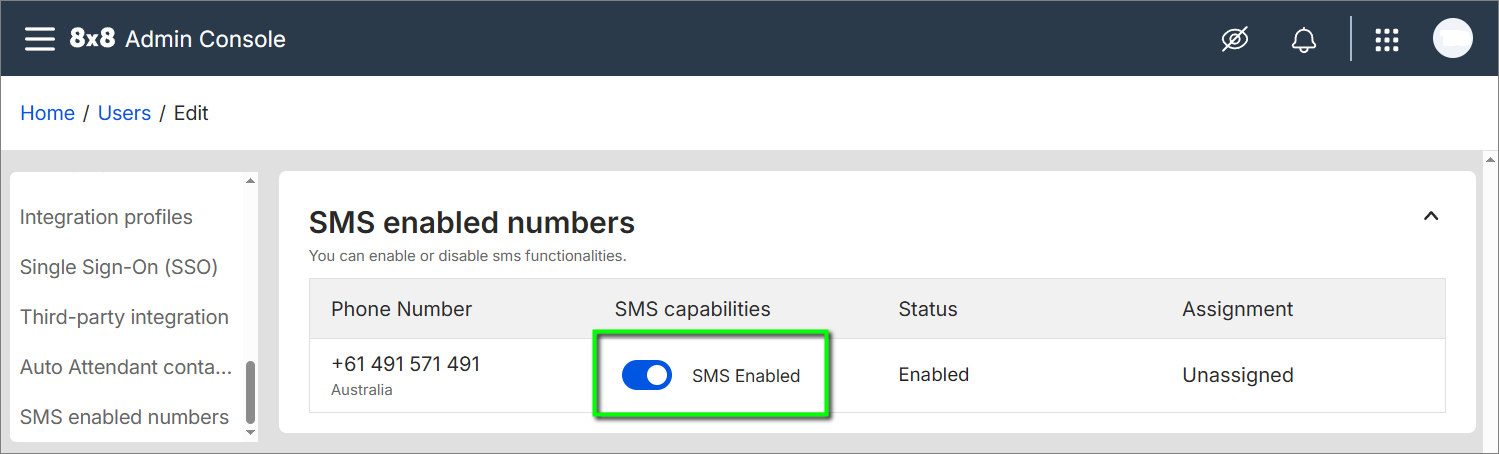 You can enable or disable an individual user's SMS functionality from their 8x8 user profile. This process works only for numbers that do not already appear on the SMS page.