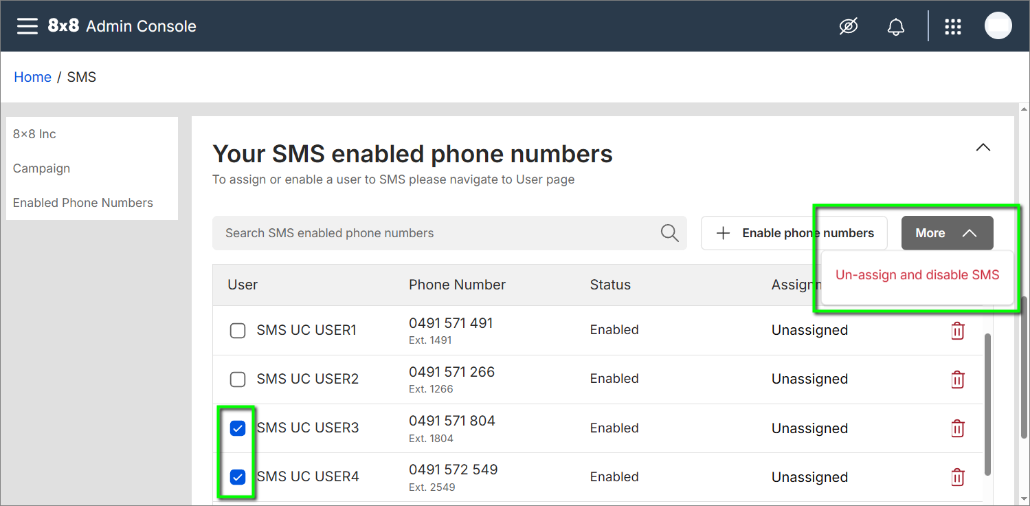 - Scroll down to Your SMS enabled phone numbers to see the list of 8x8 Work users who currently have SMS enabled on your service.