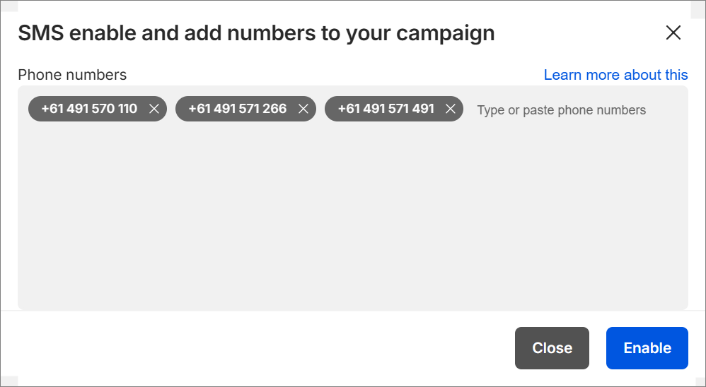 - Scroll down to Your SMS enabled phone numbers and select + Enable phone numbers.