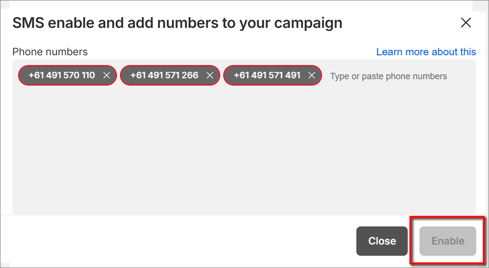 - Note: Numbers that are not assigned to users will appear in the enablement window with a red border, and the Enable button will be inactive (gray). A phone number must be assigned to a user before it can be enabled for SMS.