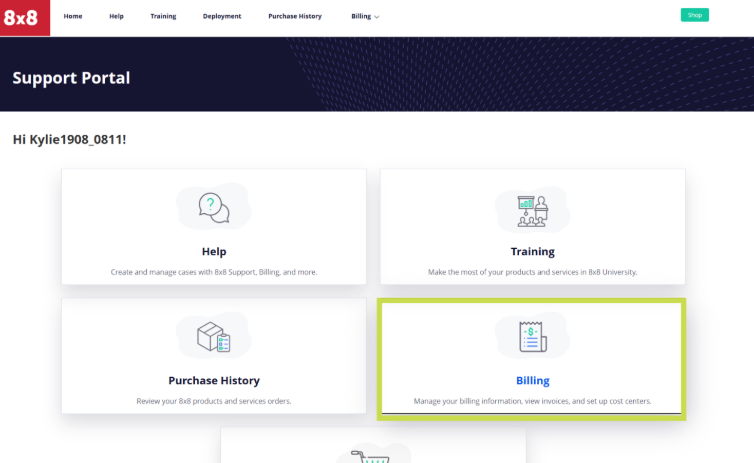 Primary Admin needs to Log in to the Support Portal (The user must have My 8x8 and Billing access. If you do not see this tile, work with your primary admin to get My 8x8 access.)