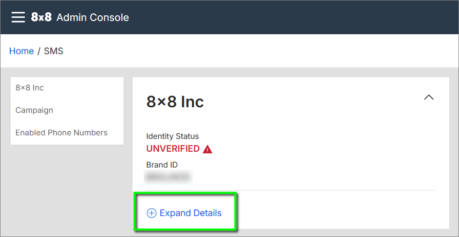 - Once the email process is complete, and TCR has processed and approved your Brand, it should appear in 8x8 Admin Console > SMS as Verified, and you can then proceed to the next steps in the SMS campaign registration process.