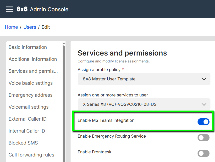 - If Auto Sync is enabled on your service in the Services > Teams section of your 8x8 Voice for Microsoft Teams admin portal, then newly-enabled users should appear in the portal within 10 minutes. If they do not appear, confirm the affected user's Microsoft licensing, and then perform a manual Sync Now operation.