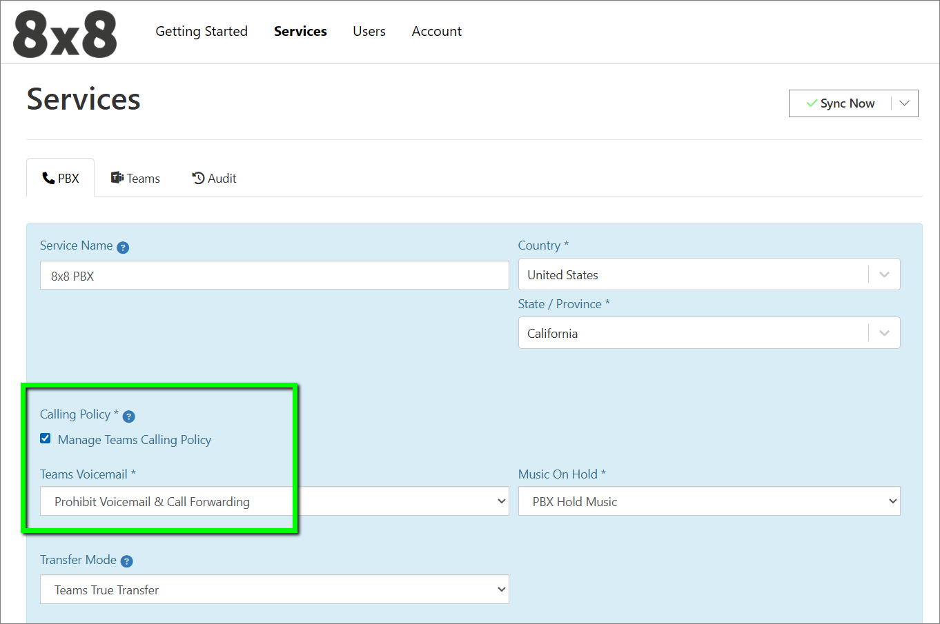 - If you are configuring ALL Teams users, be sure to enable the Services > PBX > Manage Teams Calling Policy option and set Teams Voicemail to Prohibit Voicemail & Call forwarding and click Sync Now. This ensures that 8x8 call flow is in control for how 8x8 Contact Center Queue calls are managed.