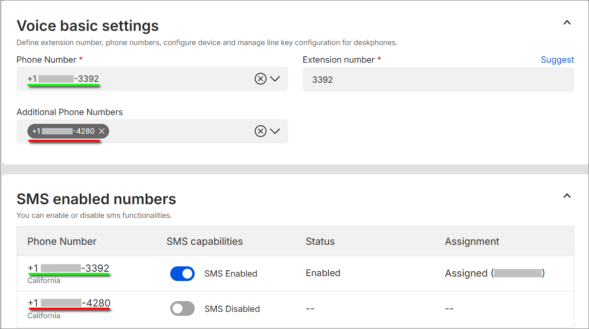 Note: Additional Phone Numbers assigned to a user in the Voice basic settings section of their 8x8 user profile cannot send or receive SMS messages of any kind unless they are enabled for SMS. Only one phone number may be enabled for SMS in a user profile at any time.