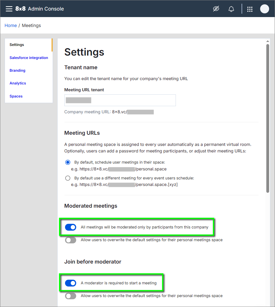 Some options in 8x8 Admin Console > Meetings > Settings can affect aspects of meeting creation and attendance.