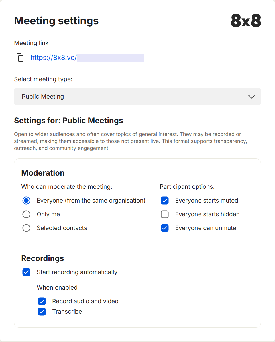 For companies that use Google Workspace products, we introduced Meeting settings in Google Calendar events. This allows individual users to modify parameters of the 8x8 meetings they’ve created.